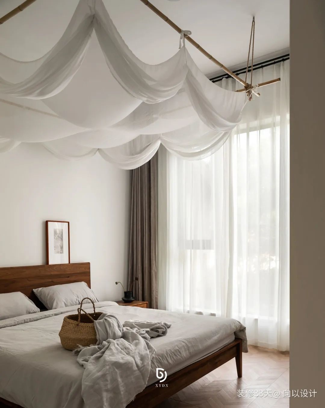 ▲ 长辈房,床上方设置了纱幔,既是一种氛围的营造,夜晚也起到了蚊帐的作用,实用美观,也符合长辈生活习惯