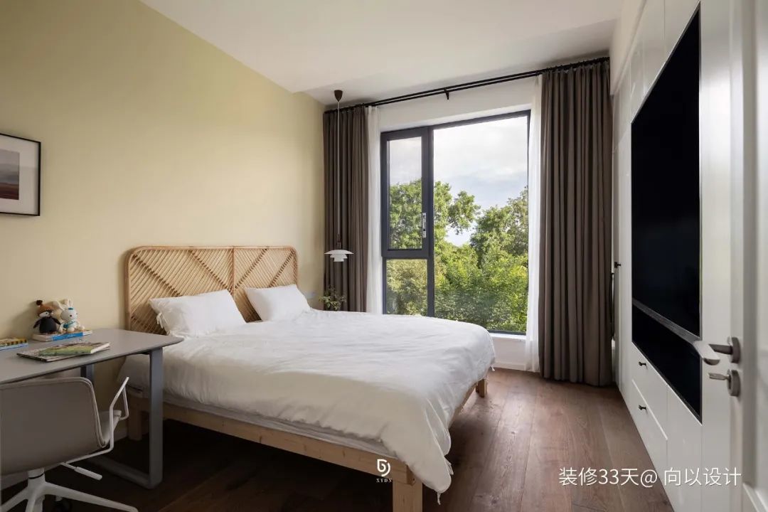 ▲ 女孩房选用了温柔的小麦色,窗外的绿植成为空间最好的装饰,床尾做了整排电视储物柜