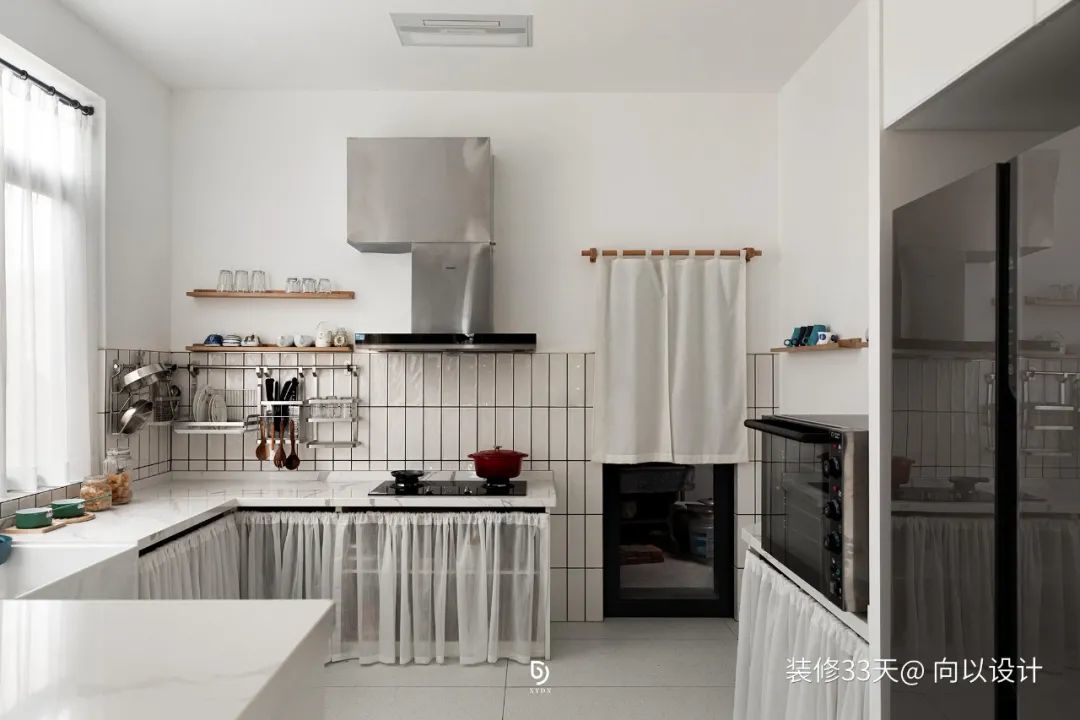 ▲ 开放式厨房,运用不锈钢的体块来遮挡油烟机的管道,美观便于打理,这里不会有爆炒油烟,更多像是西厨的功能,所以用纱帘来替代传统形式的柜门,同时也节省了不少预算,右侧掀开门帘便可通往老宅的中厨