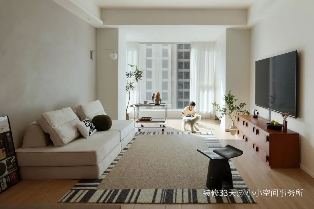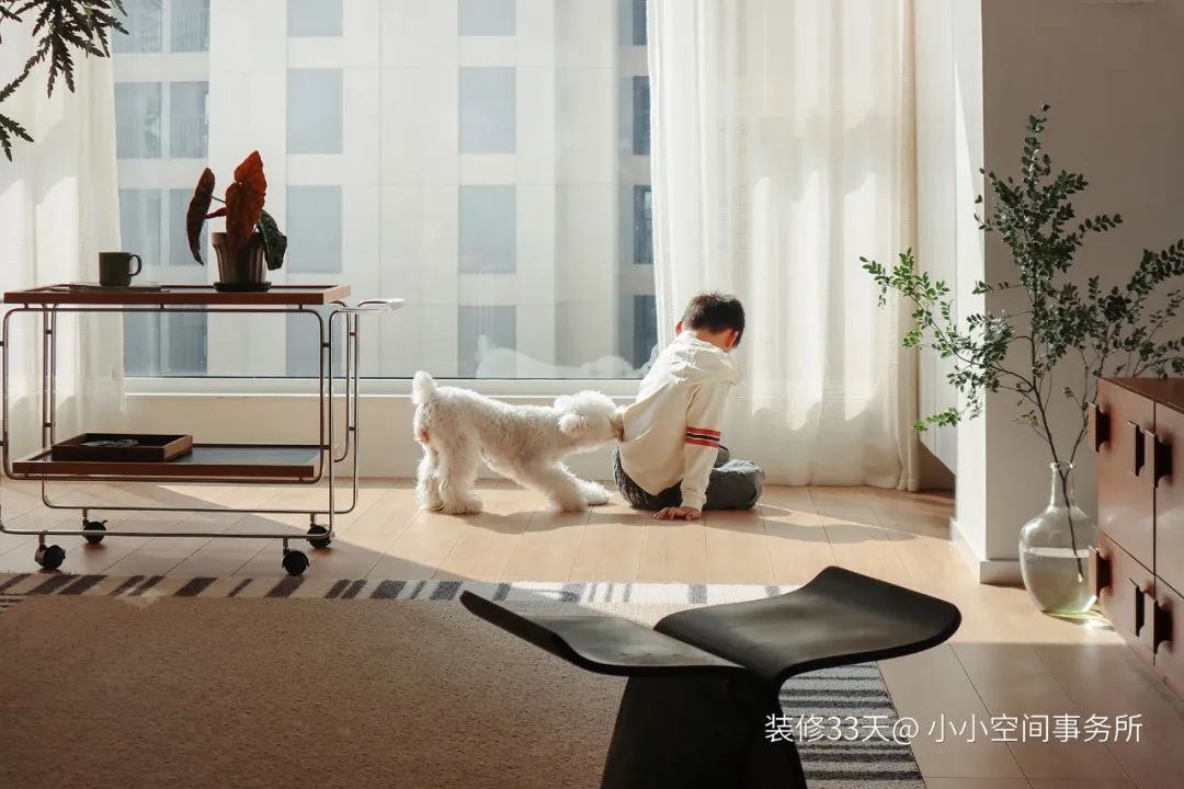 ▲ 客厅悉数由活动家具安置而成,为壮壮和哈哈留出宽阔的游玩空间。模块沙发的组合方式多样,或躺或坐随心而定。电视柜由三组实木抽屉柜拼接而成,就连边几也选用了推车方式,「自在」是整个起居空间的关键词