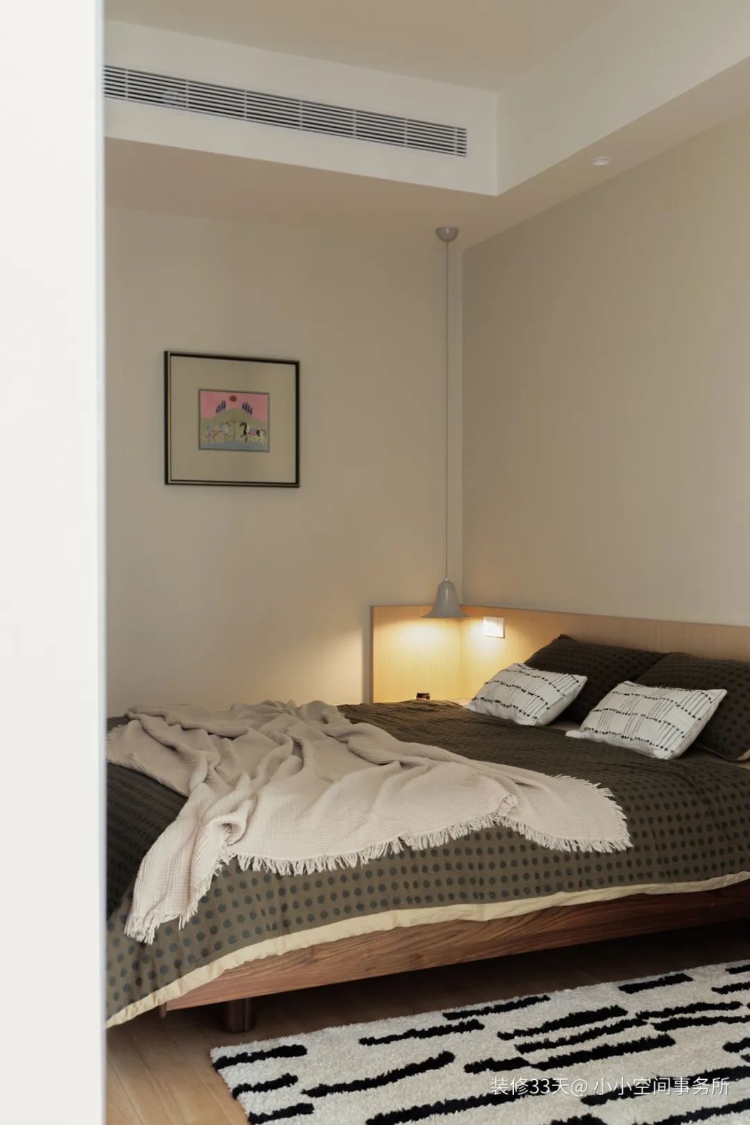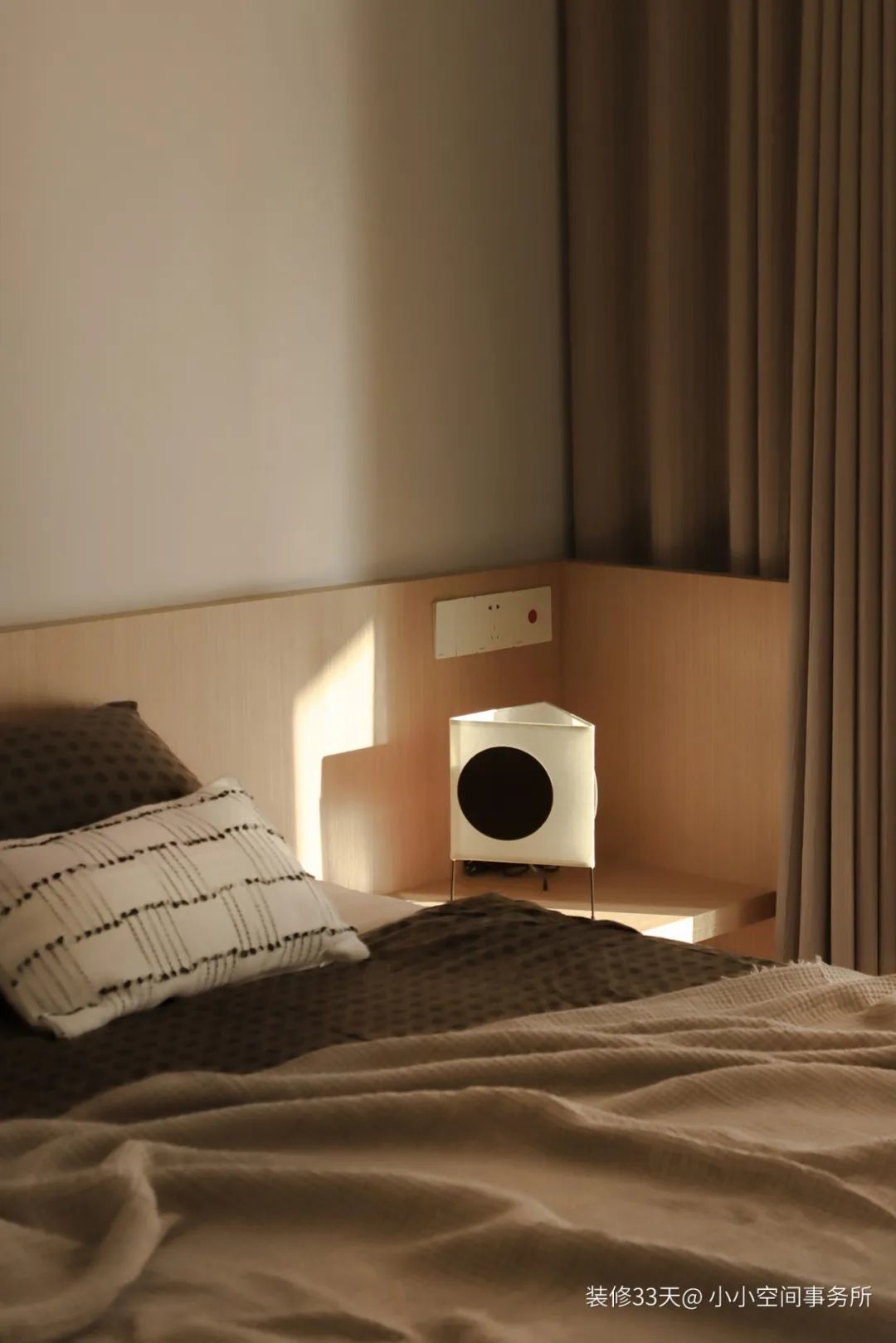 ▲ 卧室吊顶因为空调设备和原始梁位的约束,份额上简单显得空间狭小。因而规划师在床头的处理上挑选了更具延伸感的一体化规划,定制的木色床头板集成了收纳功用,调配独自收购的制品床架,尺度严丝合缝