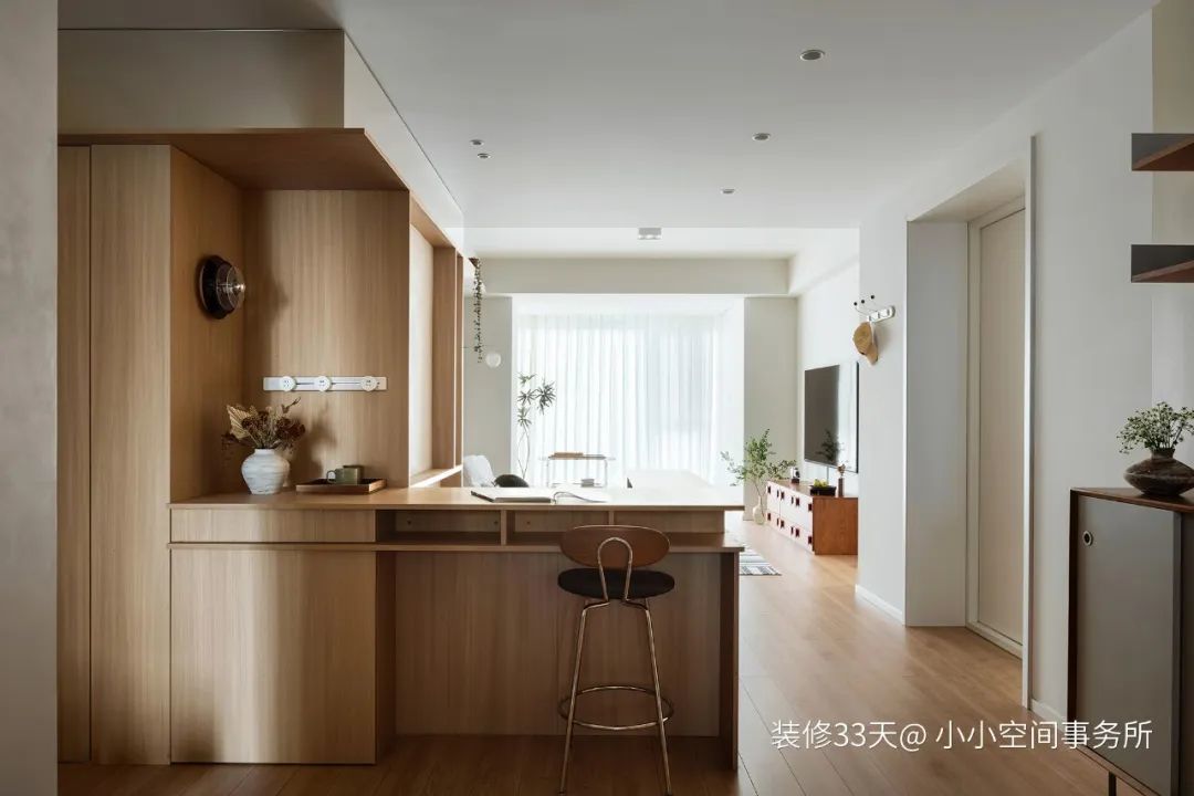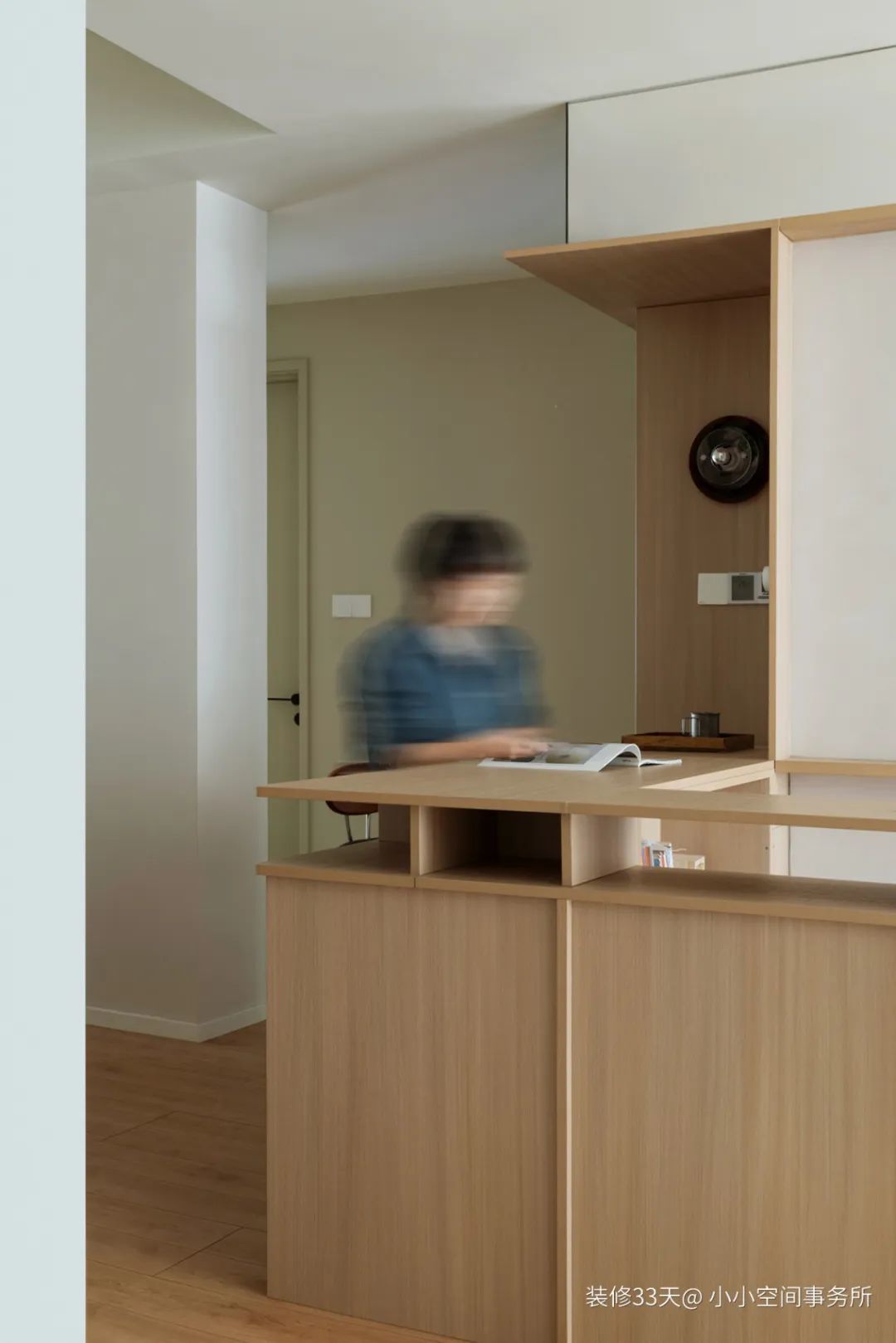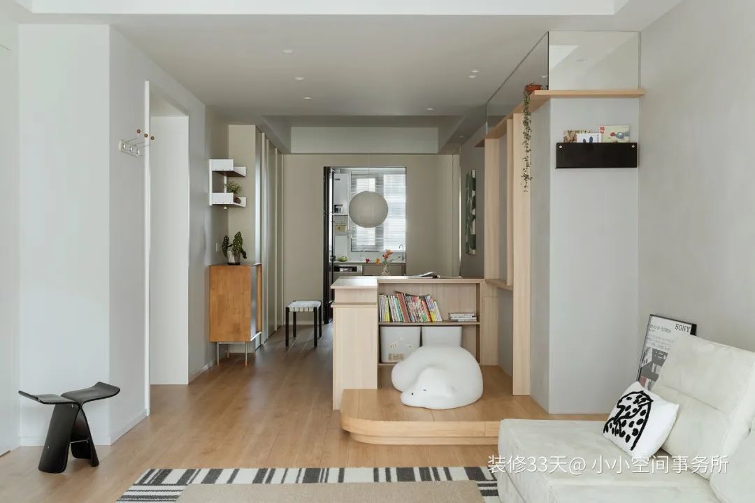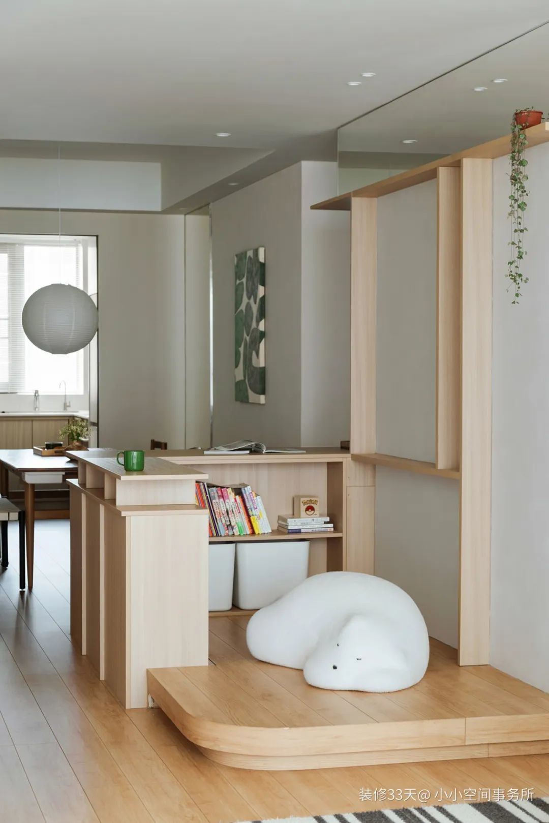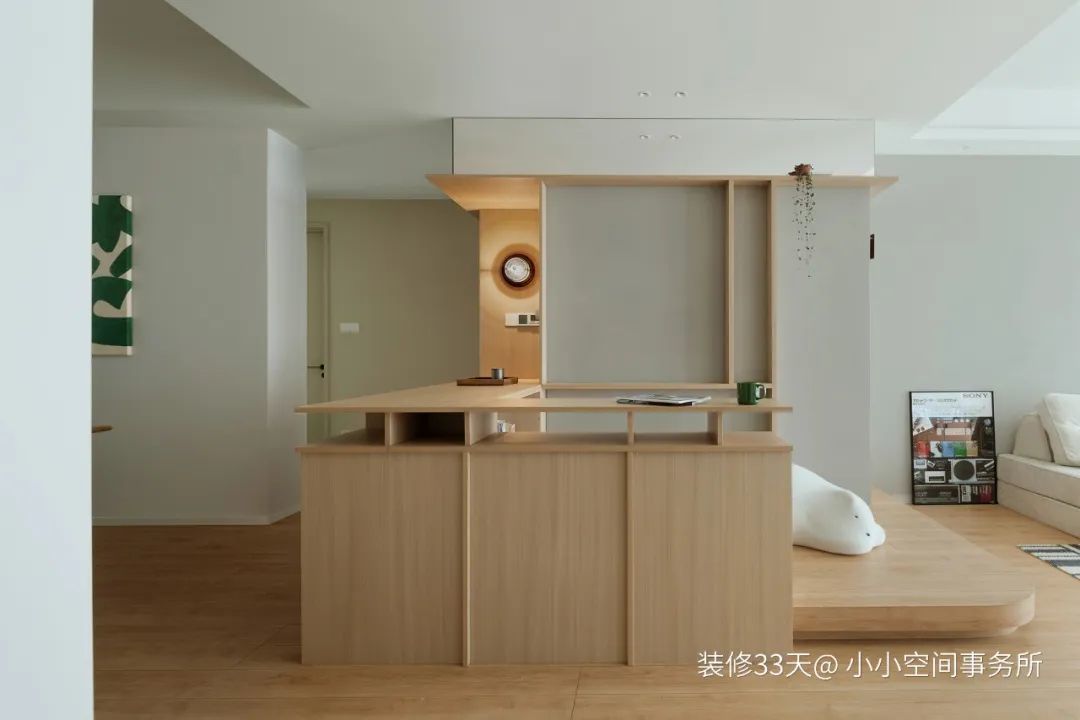 ①将入户区域的面积扩展,从头规划为吧台与地台相结合的亲子活动区,在提高了空间利用率的一同,也不影响视觉通透;