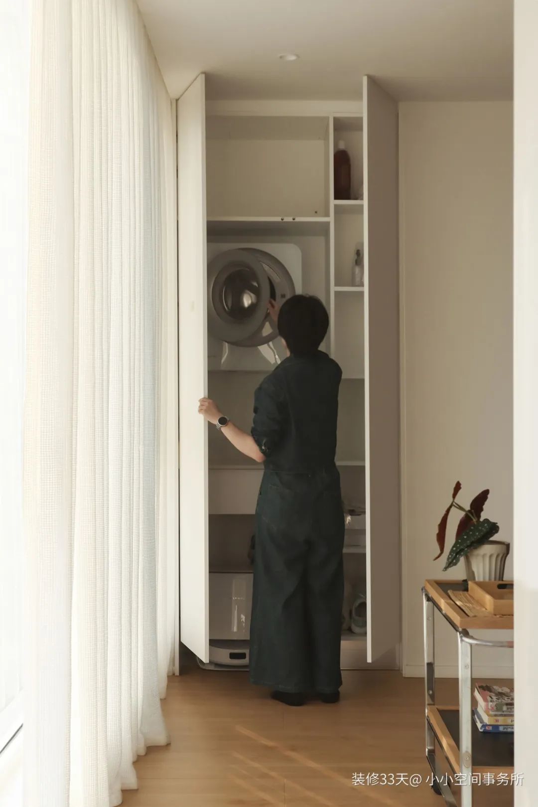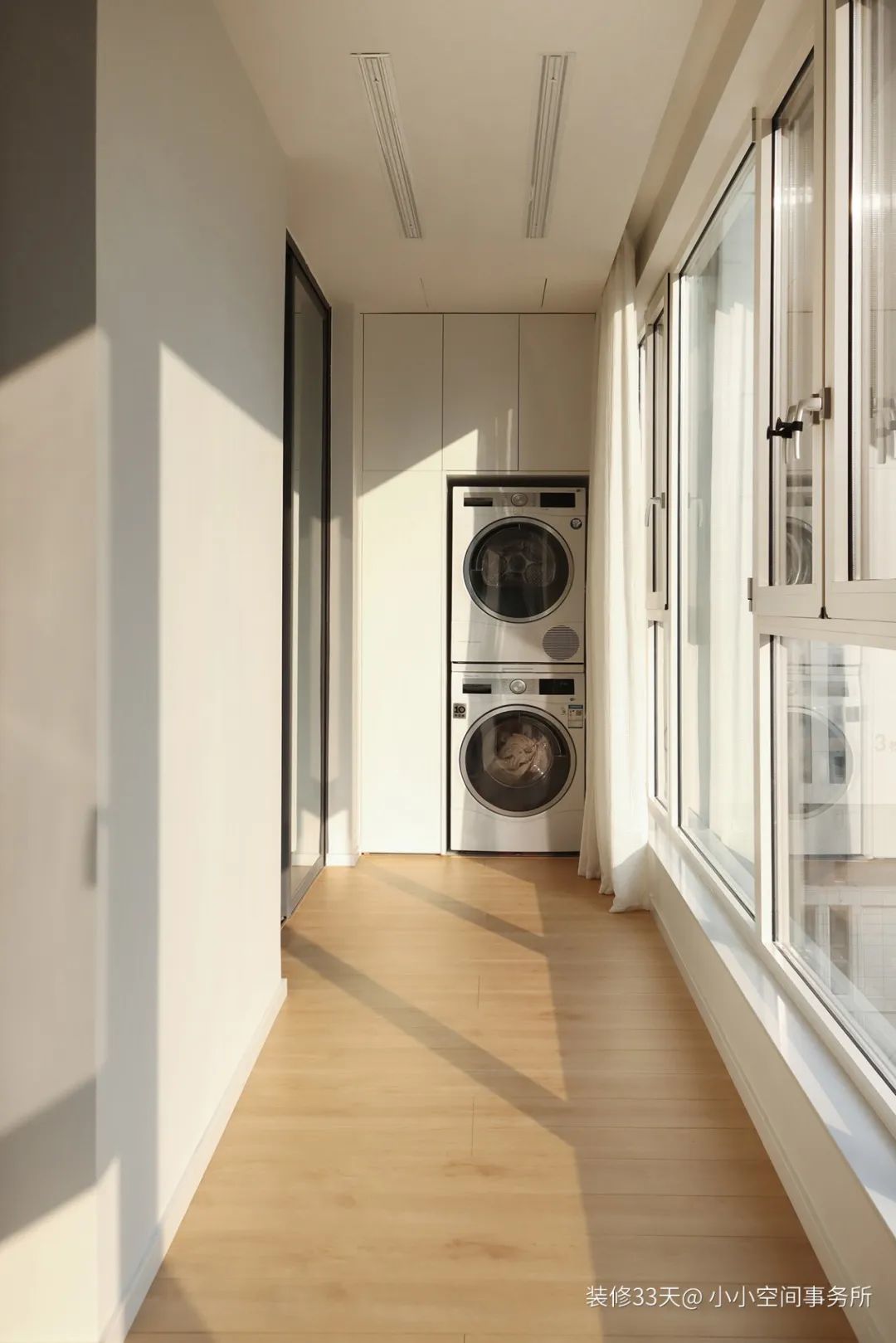 ▲ 阳台的两头都被赋予家政功用,一边的高柜里藏着小型壁挂洗衣机和扫拖机器人,另一边则是叠放的洗衣机和干衣机,顶部是隐藏式晾衣架