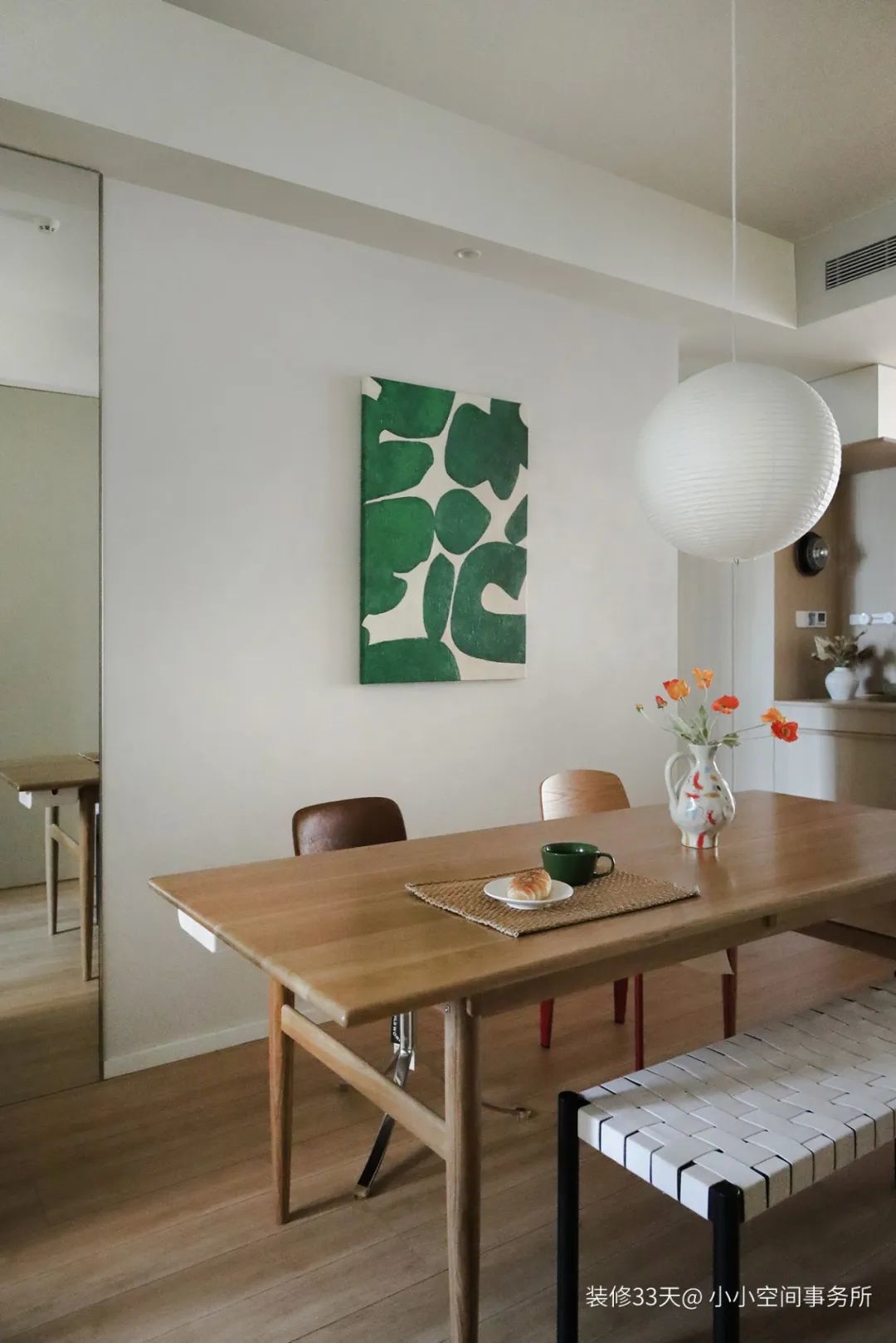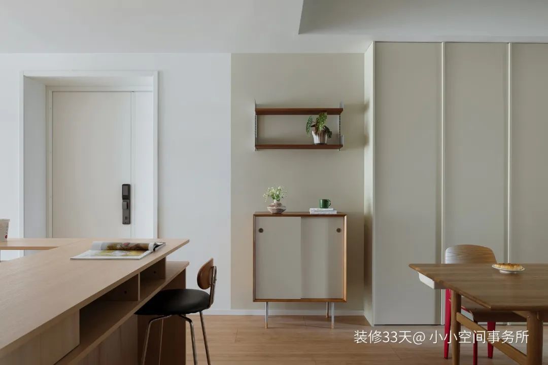 ▲ 定制柜门的色彩一向延伸到墙面,在提示餐厅空间区分的一同,也为竭尽心思挑选的乳白色餐边柜和实木层板的调配供给了布景画布