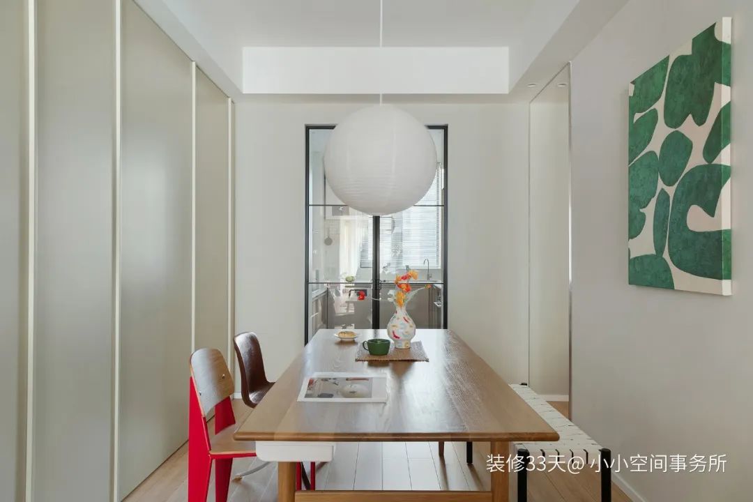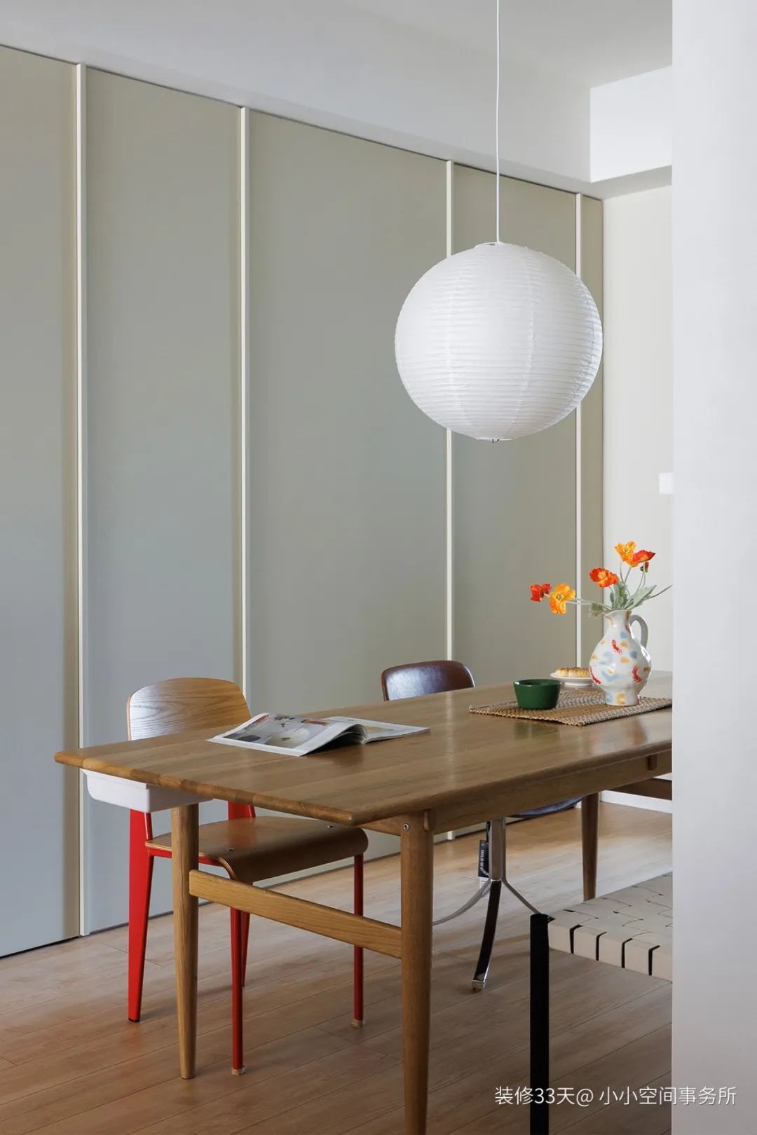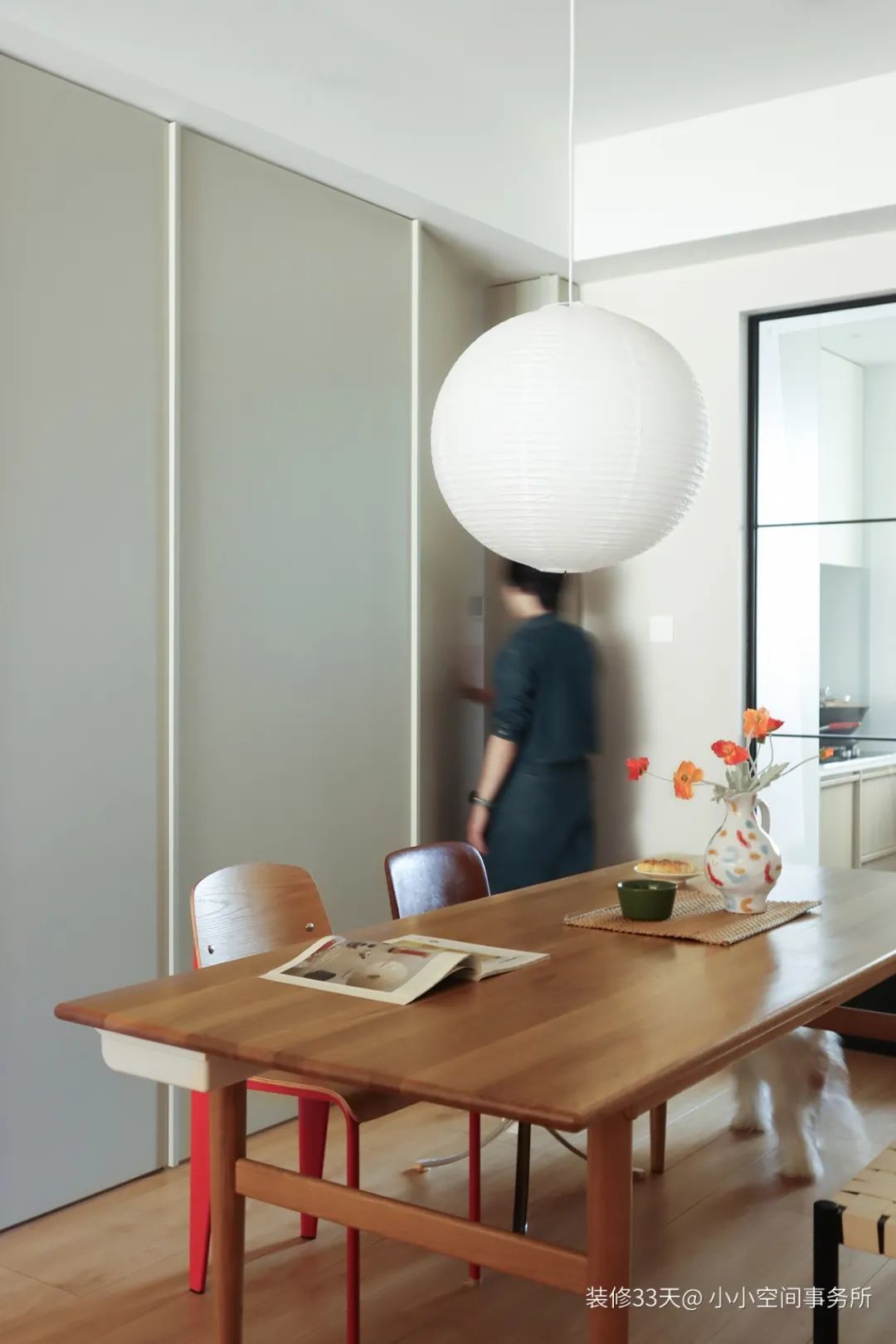 ▲ 餐厅以长桌为中心,调配各不相同的餐椅与条凳,空间就变得风趣起来。在四四方方的吊顶与餐桌之间嵌入一颗球状的和纸灯,多了一份圆润轻盈的禅意