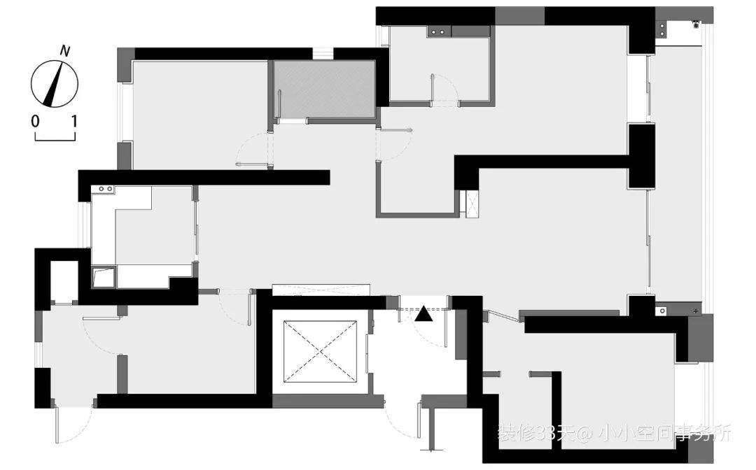 房子的原始状况为精装交给的四居室,格式相对固定。入户区域坐落房子的中心,左右别离通往餐厅与客厅,中心既是玄关又是走道,还被主卧的衣帽间借走了部分空间,整个公共区域被揉捏成「哑铃」状,分明面积不小,却显得细长又短促。